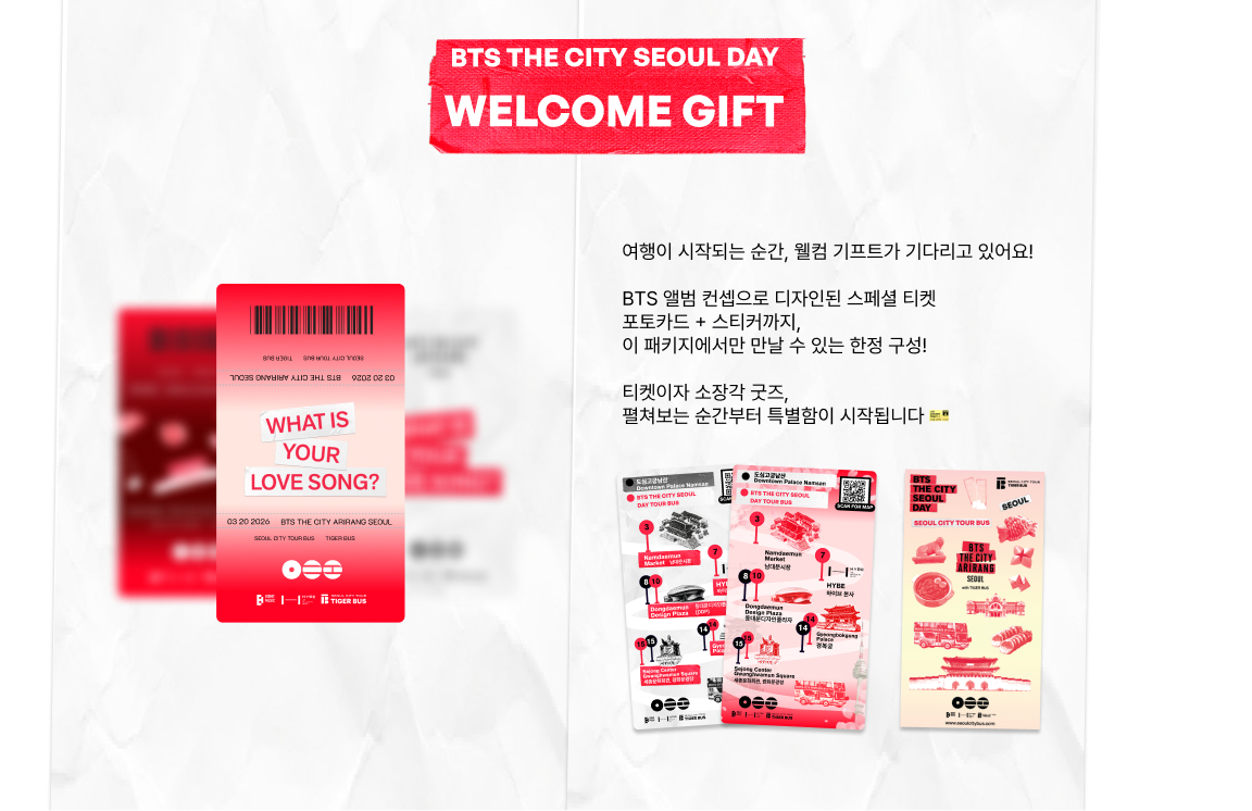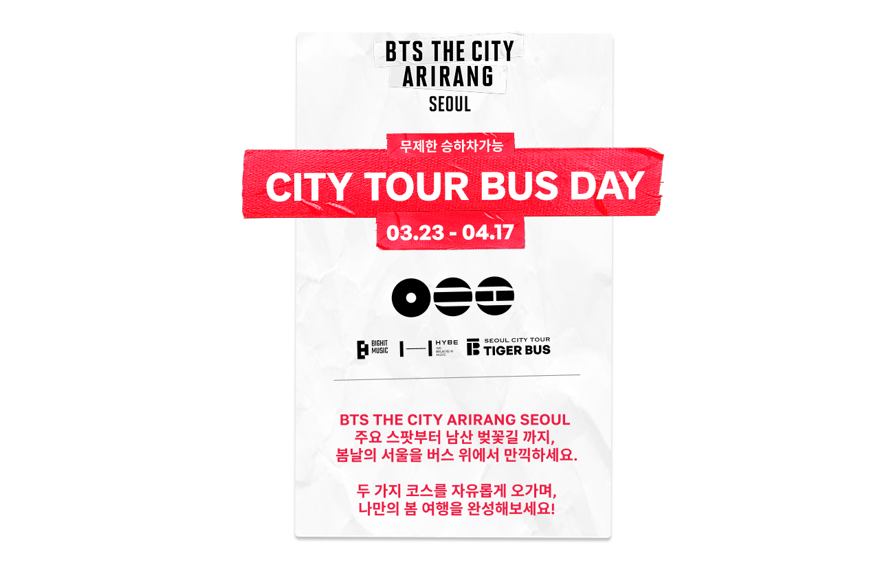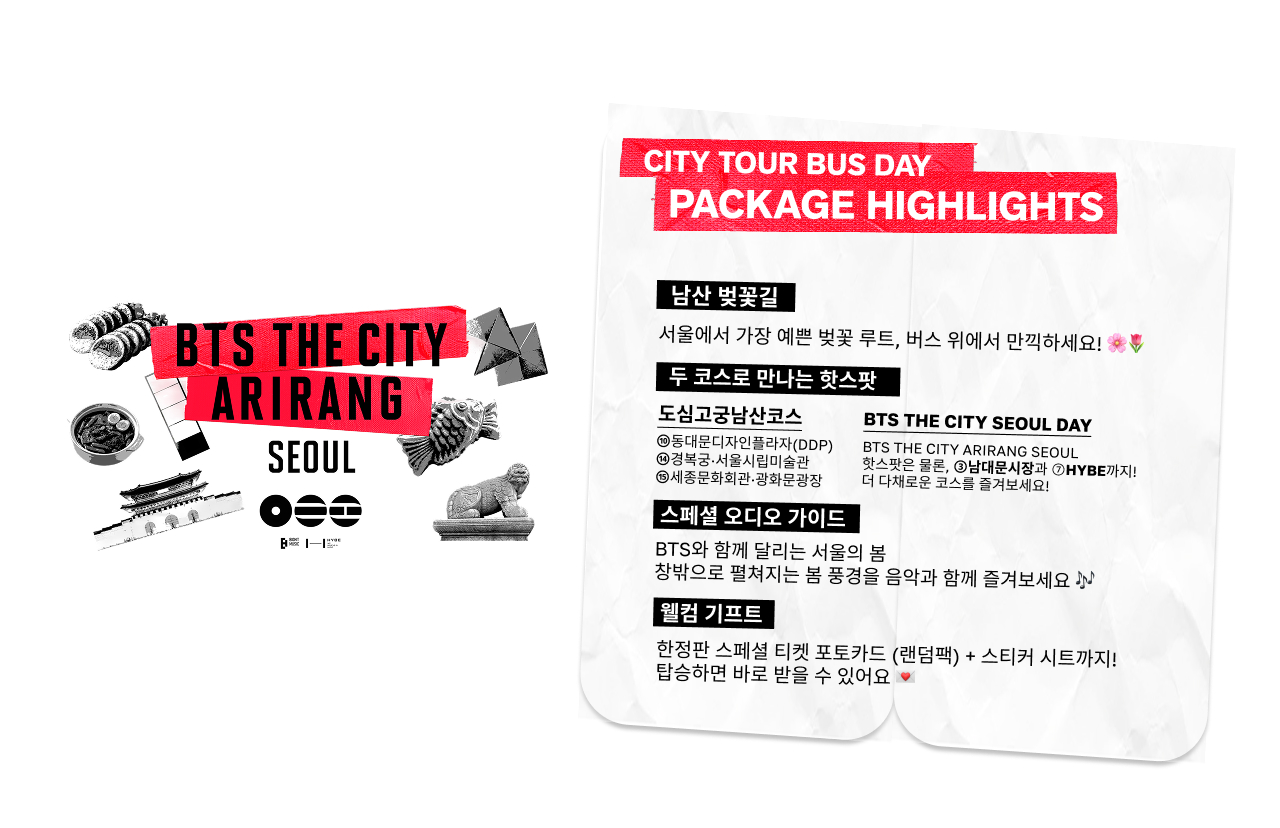 BTS THE CITY SEOUL DAY 코스는 BTS 컴백을 기념하여 서울을 방문하는 글로벌 아미(ARMY)를 위한 특별 시티투어 코스입니다. 하이브 본사, 남대문시장, 동대문디자인플라자, 경복궁/국립현대미술관 등 주요 지점을 포함하여 광화문, 덕수궁, 이태원, 인사동 등 서울의 대표 관광지를 순환하며 버스에서 BTS 대표곡과 함께 아미들이 사랑하는 서울의 특별한 순간들을 경험할 수 있습니다.
