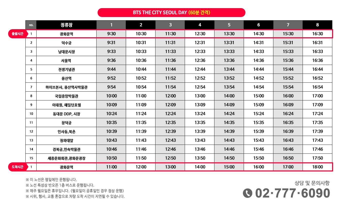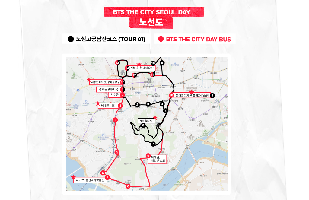 * BTS THE CITY SEOUL DAY 코스는 순환 코스로 원하는 정류장에서 자유롭게 하차 후 다음 버스를 이용할 수 있습니다.